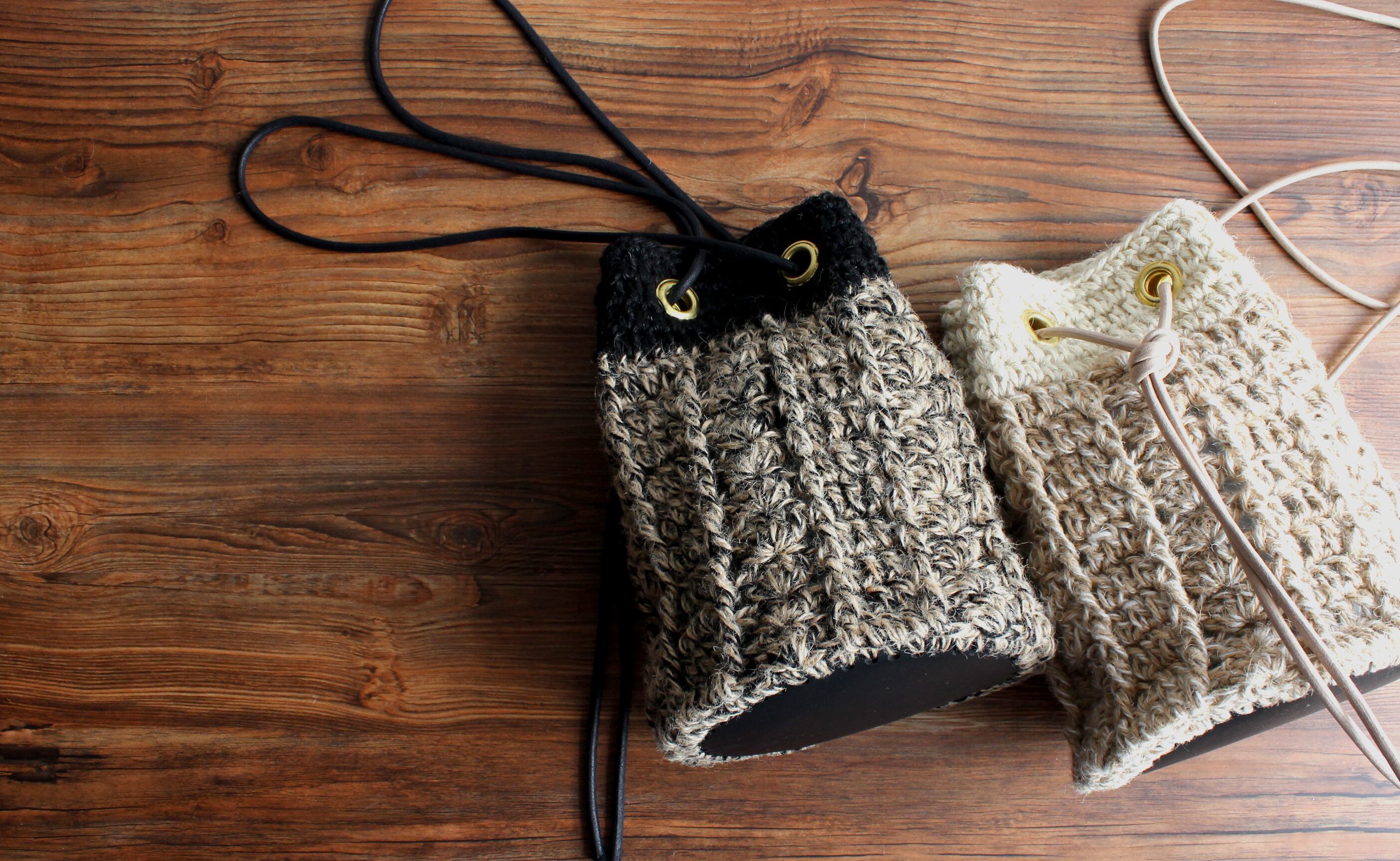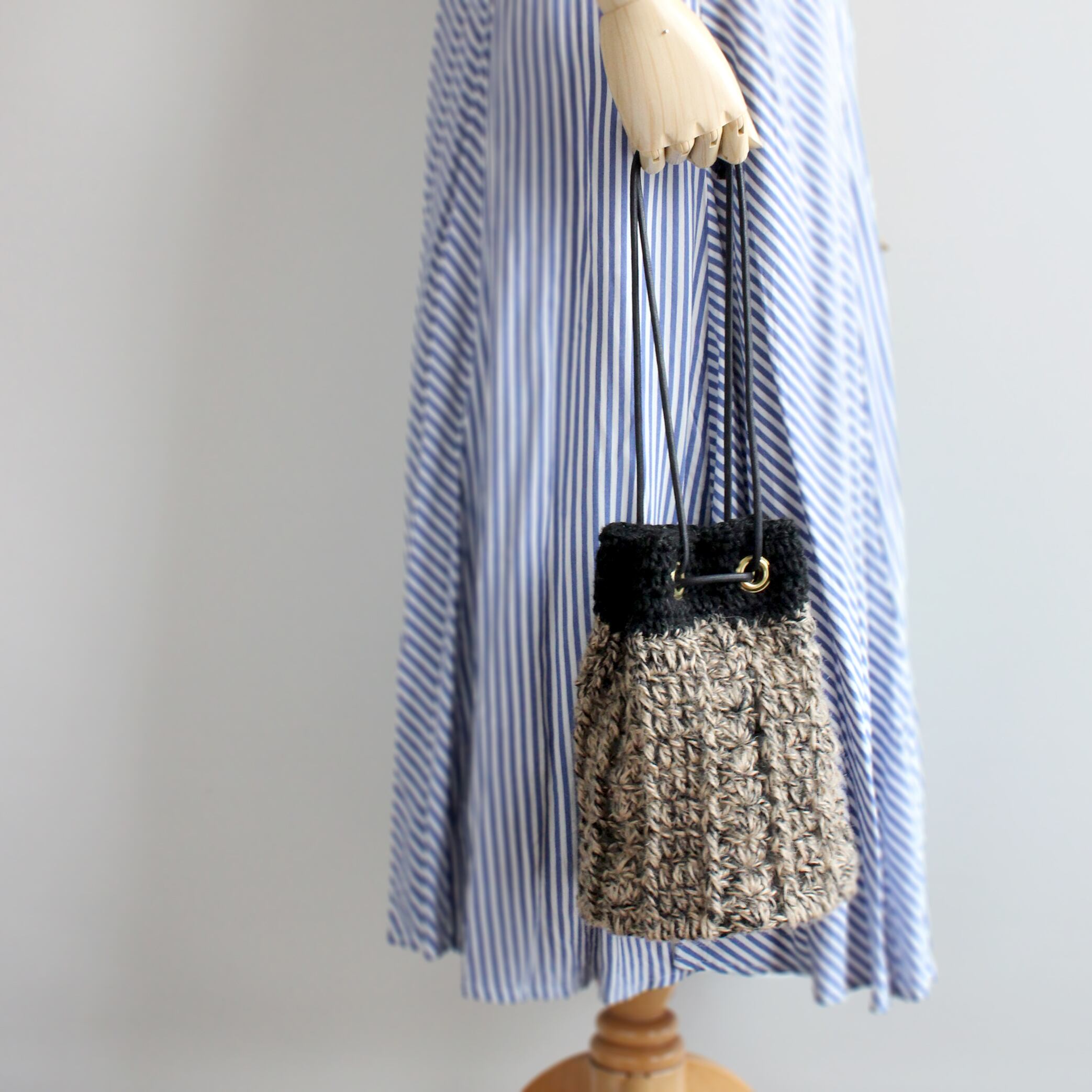 ジュートとリネンがツイストされた、ナチュラルな糸で編む巾着型のバッグです。