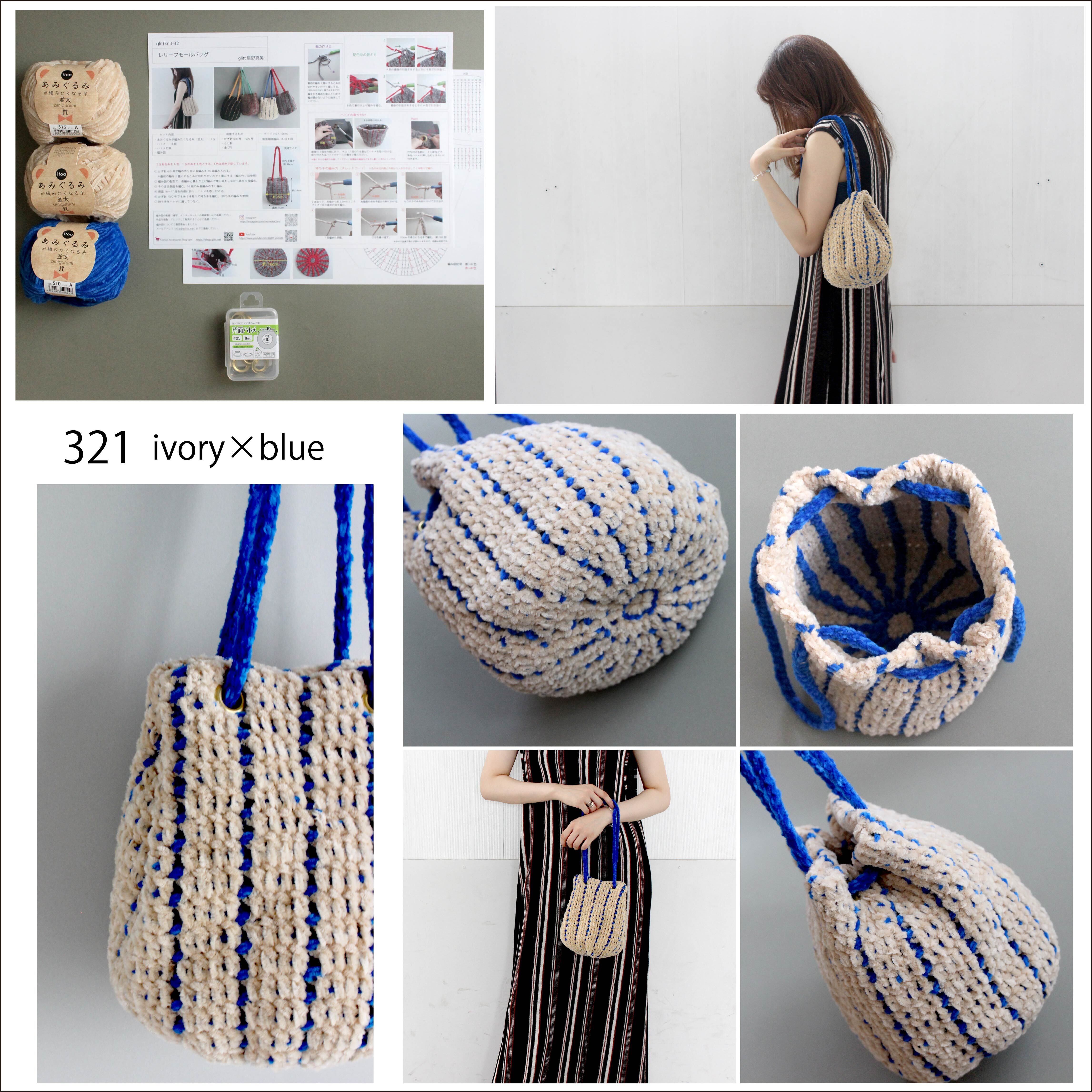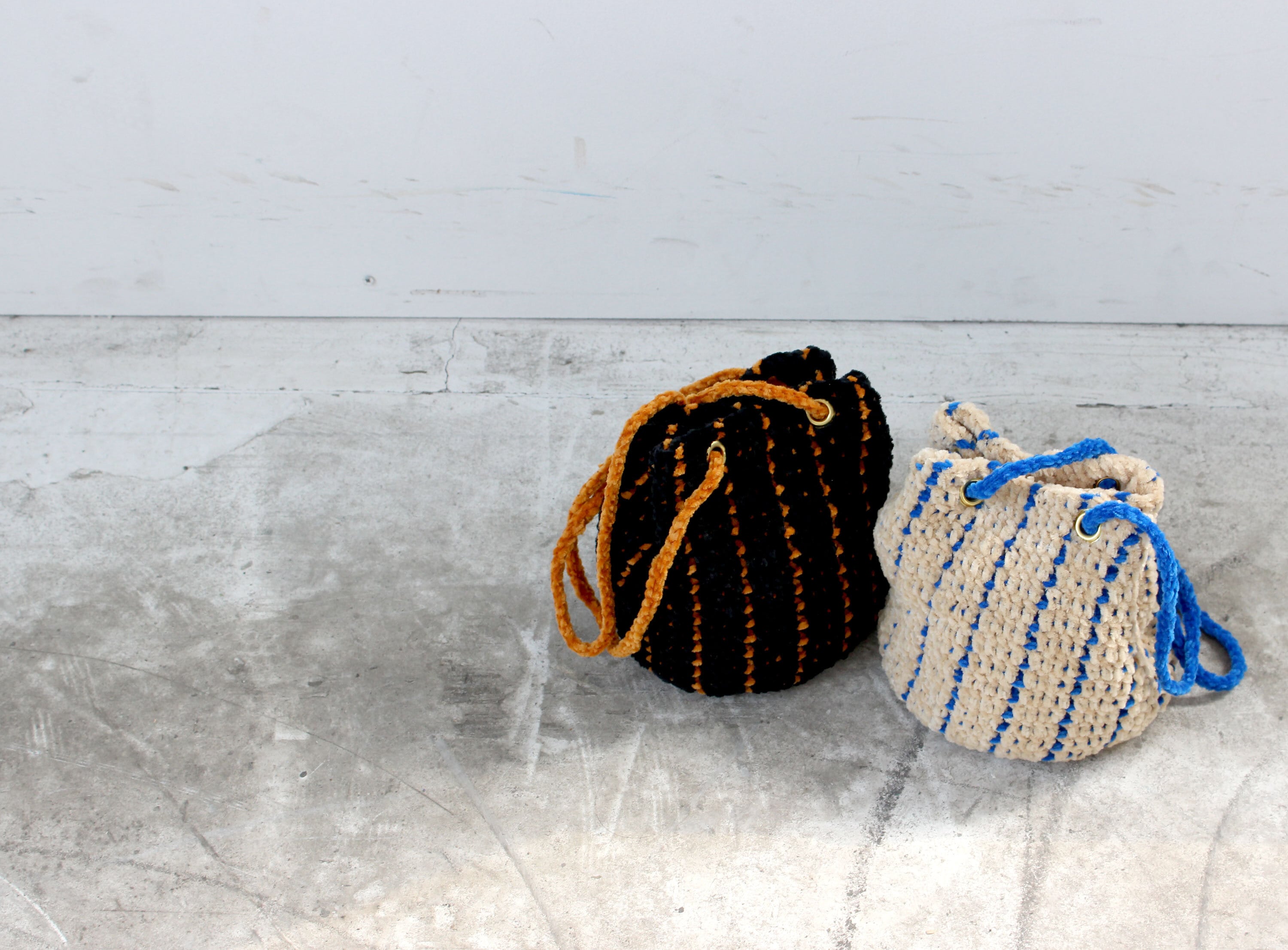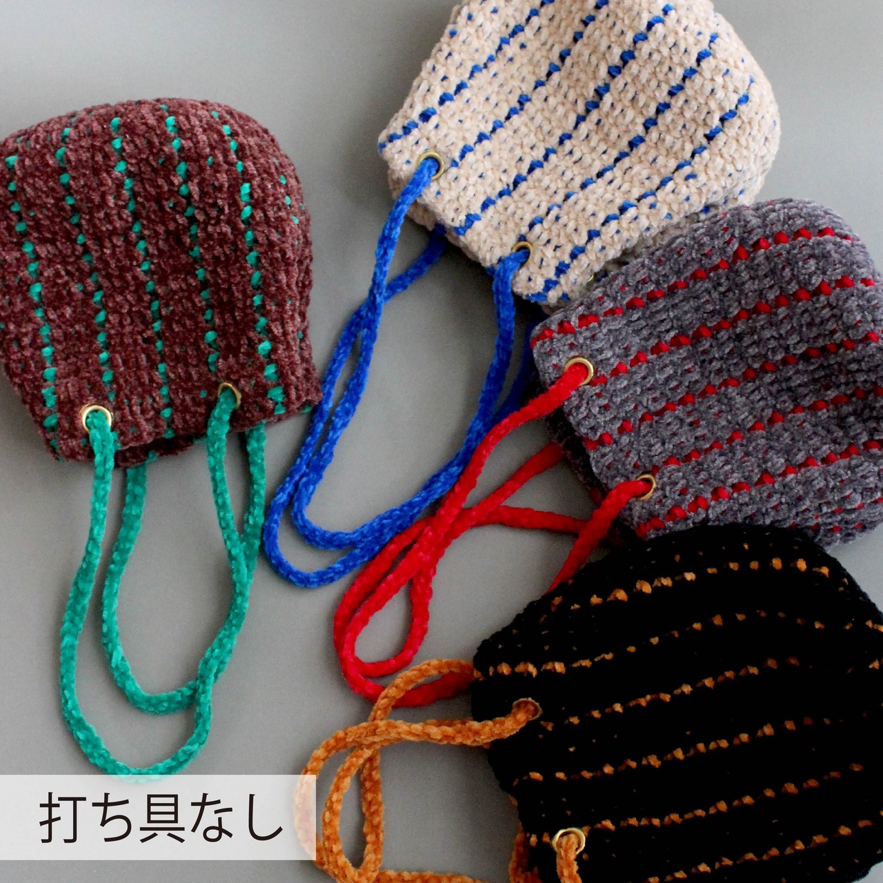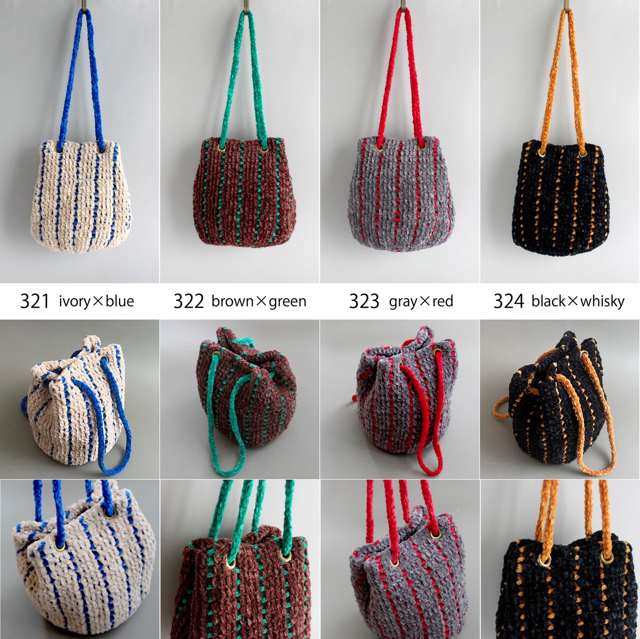 モールヤーンで編むベロア調のやわらかなバッグです。