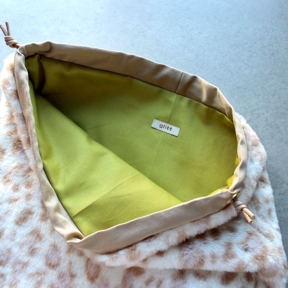 オフホワイト×ミルクティーカラーのレオパード柄(豹柄)のエコファー(フェイクファー)使用。